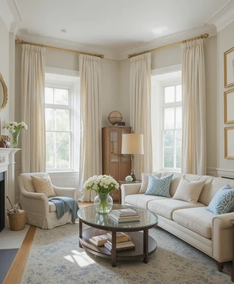 Mounting your curtain rod closer to the ceiling makes the room appear taller. I usually go for long, flowy curtains that slightly touch the floor—they create a soft, elegant look. Light fabrics work best because they allow more natural light to filter in.