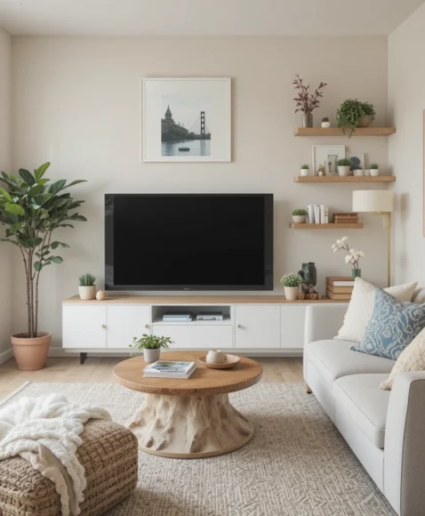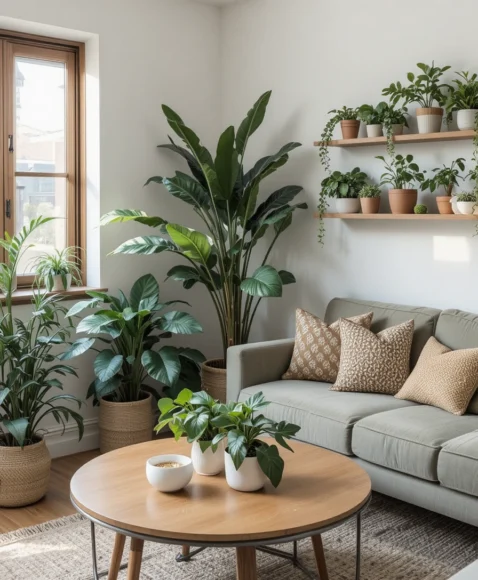 Even small rooms benefit from greenery. A tall plant in a corner or a few small pots on shelves add life and color. I find that plants make the space feel breathable and warm, especially when paired with natural textures.
