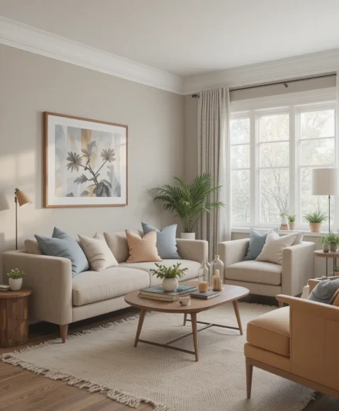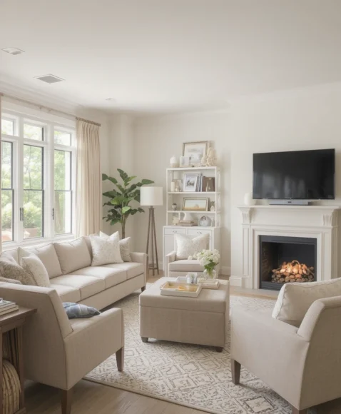 Light tones instantly make any room feel larger. Soft whites, creams, and beiges reflect light beautifully, so your living room feels airy without much effort. I find that using one consistent shade across walls helps avoid visual clutter and keeps the room feeling calm.