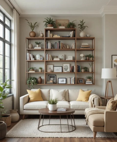 If the floor space is limited, think upward. Tall shelves draw the eye upward and give you plenty of storage for books, plants, or décor pieces. I’ve seen how placing vertical shelves on narrow walls keeps the room feeling open.