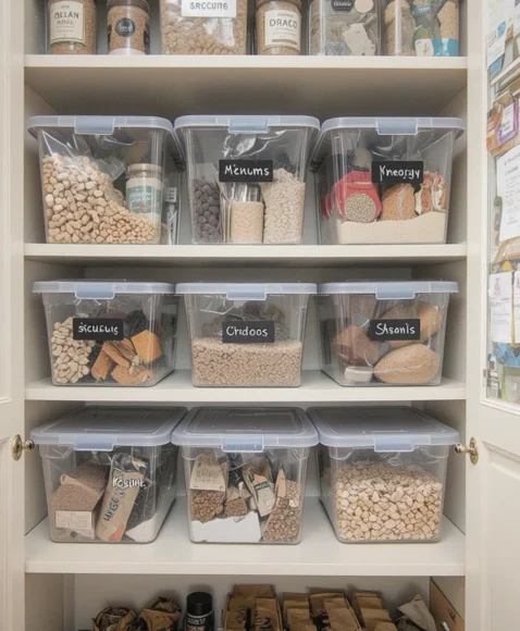 Using clear bins keeps ingredients organized and easy to find. I like labeling mine with bold, readable tags. Not only does it look tidy, but it also helps me quickly know what’s running low, preventing unnecessary trips to the store.