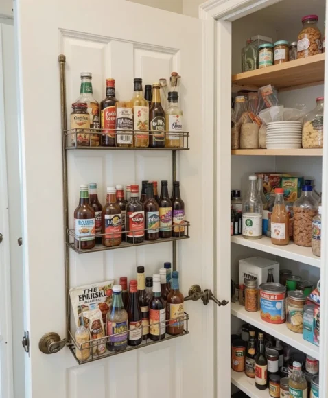 One of my favorite tricks is adding storage racks on the pantry door. It’s ideal for small bottles, condiments, or snacks. This tiny adjustment instantly creates extra space without making the pantry feel crowded.