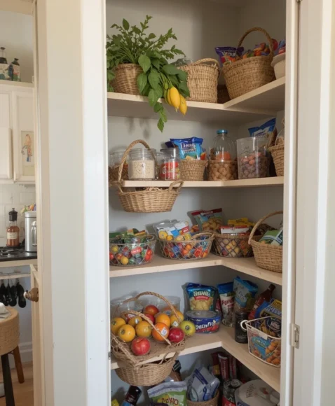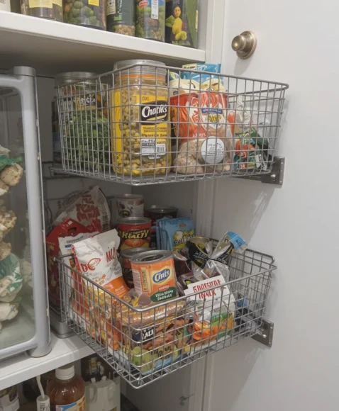 Adding hanging baskets for fruits, vegetables, or packaged snacks frees up shelf space. I hang mine from the underside of shelves, making the pantry look open and less cramped. It’s both decorative and functional.