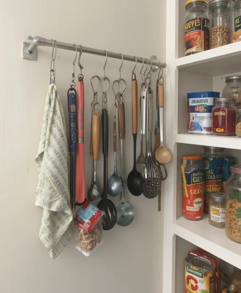 A small rod with hooks for measuring spoons, scissors, or kitchen towels is another space-saver. I hang mine along the pantry wall, which keeps essentials within reach without cluttering the shelves.