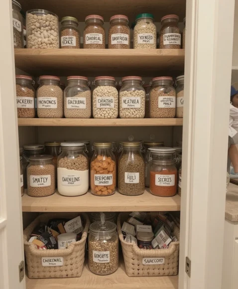 Labels are a small detail that makes a big difference. I like using bold fonts on jars, bins, and baskets. It not only keeps my pantry organized but also makes restocking simple and stress-free.