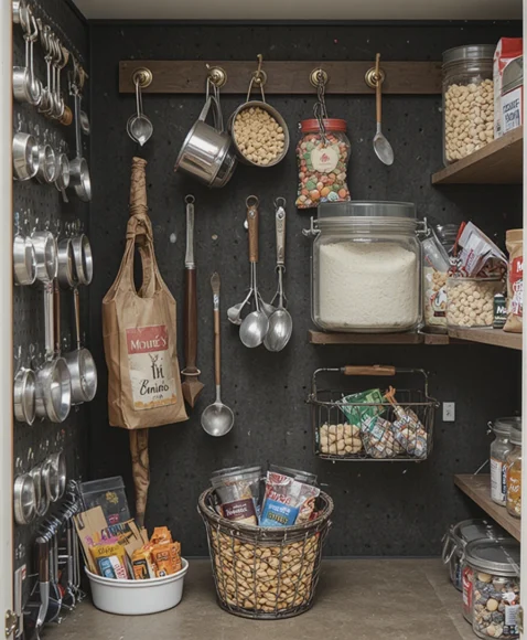 Installing a pegboard inside the pantry allows hooks for measuring cups, small tools, or baskets. It’s a fun way to customize storage and maximize vertical space. I even hang small baskets for nuts and snacks—it keeps everything organized and accessible.