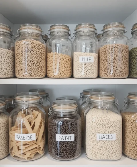 Transferring pantry staples into reusable jars like pasta, rice, or lentils looks chic and keeps everything airtight. I always label mine, which prevents confusion and adds a decorative touch to my pantry.