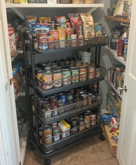 A slim rolling cart can slide into narrow pantry gaps. I use mine for canned goods and snacks. It’s perfect because I can pull it out fully and grab what I need, then tuck it away neatly.