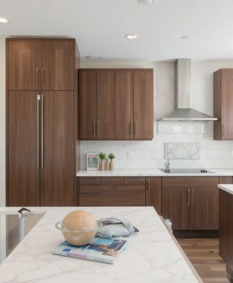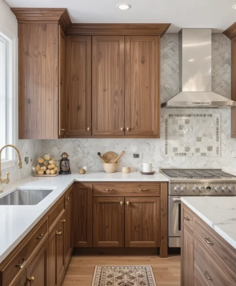 Brass hardware adds a touch of elegance to walnut cabinets. This combination feels warm and stylish, especially when paired with a soft neutral backsplash. It’s a small detail that makes a big impact.