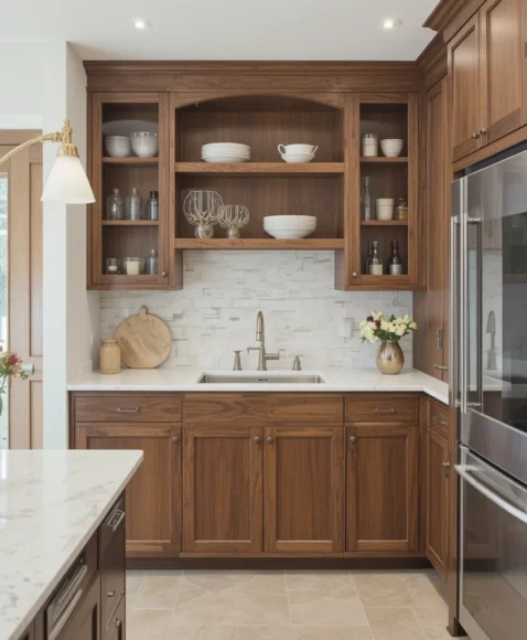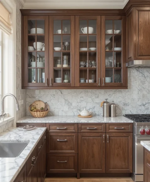 Glass-front upper cabinets lighten the look of walnut kitchens. They add visual space while keeping storage functional. A neutral backsplash helps keep the focus on the cabinet design.