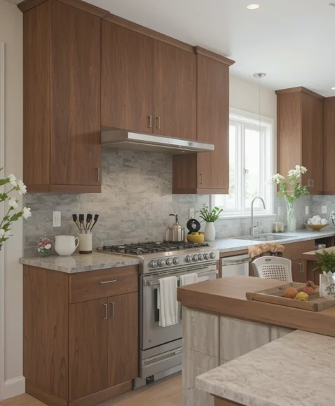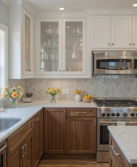 Using walnut cabinets on the lower section and white cabinets above keeps the kitchen feeling bright and balanced. A soft-toned backsplash helps blend both colors smoothly while keeping the focus on the walnut base cabinets.