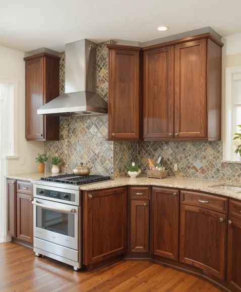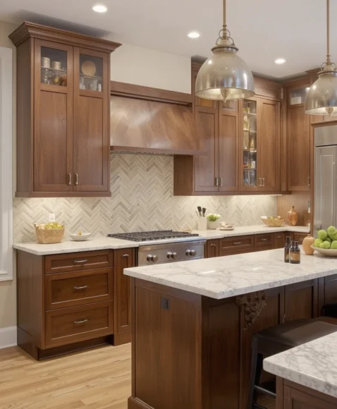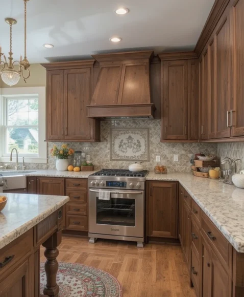 This idea leans into farmhouse warmth. Walnut cabinets paired with a natural stone backsplash create a grounded, earthy feel. It works especially well in kitchens with wooden beams or farmhouse sinks.