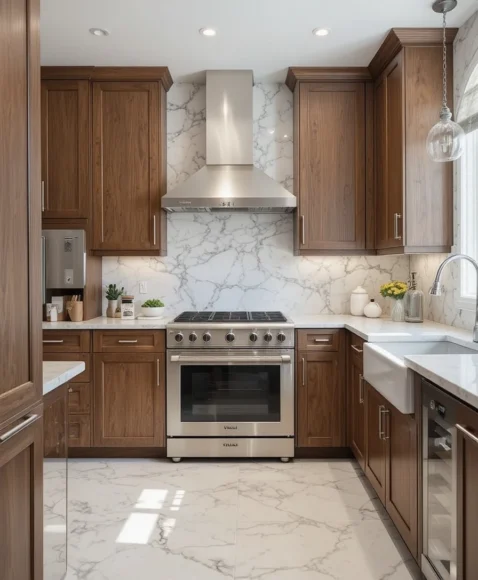 White marble backsplashes add elegance without overpowering walnut cabinets. The soft veining complements the wood grain beautifully. This idea works well in both modern and classic kitchens.
