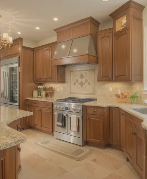 Beige walls and counters enhance the natural warmth of walnut cabinets. This color scheme feels calm and welcoming. A soft-toned backsplash keeps everything cohesive and easy on the eyes.