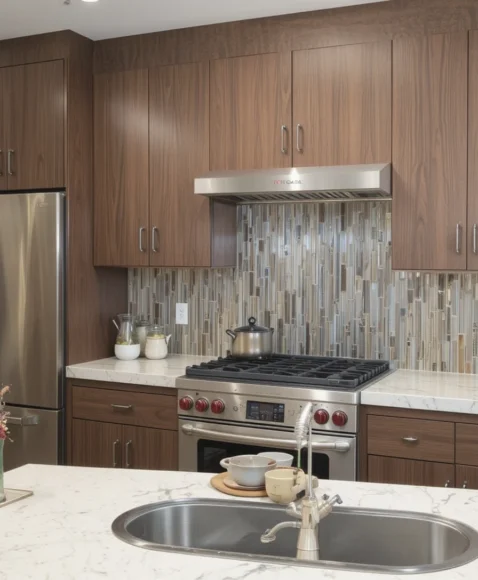 Vertical tiles draw the eye upward, making the kitchen feel taller. I love how they add a modern twist to walnut cabinets. Stick to neutral shades to maintain balance.