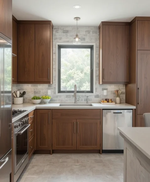 Gray countertops balance the warmth of walnut cabinets beautifully. This pairing feels modern and calm. Add a backsplash in soft gray or white to create a smooth flow across the kitchen.
