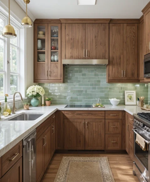 A soft green backsplash adds a fresh, natural touch to walnut cabinets. It feels calm and refreshing without being overpowering. This combination works well in kitchens with lots of natural light.