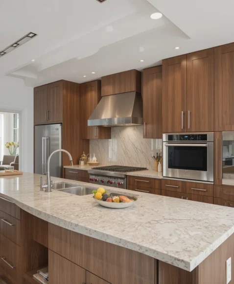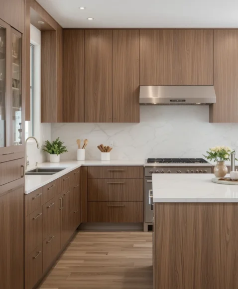 I love how walnut cabinets look next to bright white quartz counters. The contrast keeps the kitchen feeling clean and modern while still warm. Adding a simple white tile backsplash ties everything together without stealing attention from the wood grain.