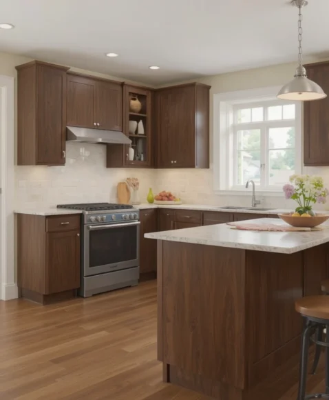 Dark walnut cabinets can feel cozy instead of heavy when balanced with a light color scheme. Soft walls, pale counters, and a simple backsplash help maintain brightness while keeping the rich cabinet tone.