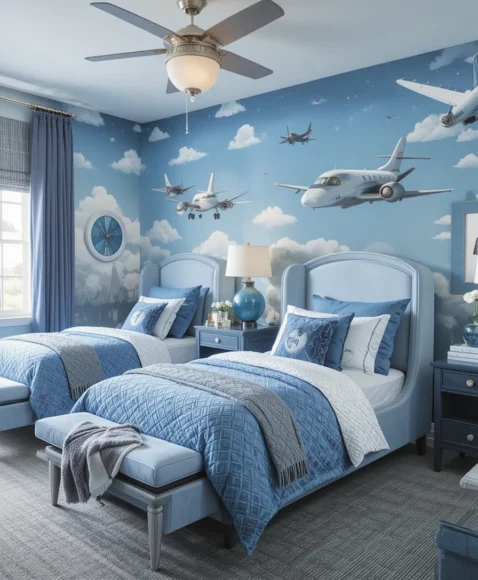 An aviation-themed bedroom inspires dreams of flying. Wall murals of planes, cloud decals, and airplane-shaped beds set the scene. Bedding and decor in blue and white create a sky-like ambiance. This theme is perfect for boys fascinated by aircraft, adventure, and exploration.