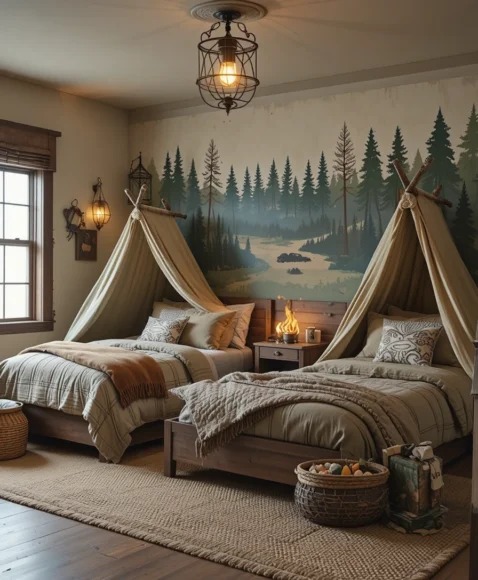 A camping-inspired bedroom brings the outdoors inside. Use tent-style beds, faux campfires, and nature-themed wall art. Bedding in earthy colors and lanterns for lighting enhance the theme. This bedroom creates a cozy, adventurous atmosphere where he can enjoy pretend camping indoors.
