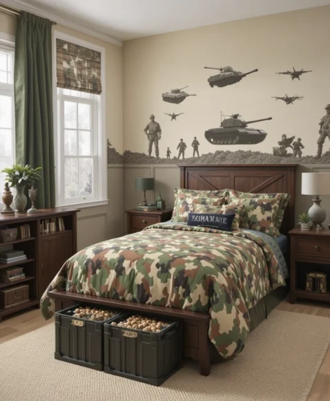 A military-themed bedroom appeals to boys fascinated by action and strategy. Camouflage bedding, wall decals of tanks or jets, and toy soldiers make the space exciting. Neutral wall colors like beige or green give a realistic feel, and storage bins shaped like crates can keep toys organized while enhancing the theme.