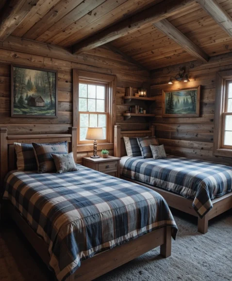 A mountain cabin-inspired bedroom offers a rustic, cozy feel. Wooden beds, plaid bedding, and forest-themed wall art create a warm atmosphere. Accessories like lanterns or log-shaped shelves enhance the cabin charm. This idea is great for boys who enjoy nature, hiking, or rustic aesthetics.