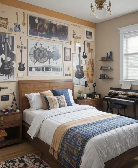 A music-inspired bedroom is perfect for budding musicians. Include wall art of instruments, music note decals, or a small keyboard corner. A guitar stand or drum set can double as decor. This setup encourages creativity and provides a personal space for him to enjoy and develop his musical interests.
