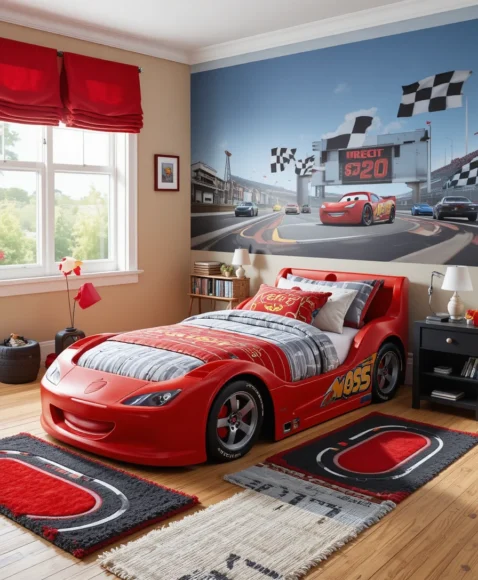 A race car bedroom is thrilling for young speed enthusiasts. Use car-shaped beds, tire-inspired rugs, and checkered flags as decor. Bedding featuring cars or tracks adds excitement. You can also include wall decals of racing scenes for an energetic and fun atmosphere that inspires imagination.