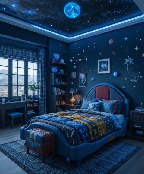 A space-inspired room is perfect for young boys fascinated by planets and astronauts. Dark blue or black walls with glow-in-the-dark stars, a rocket-shaped bed, and themed bedding create an immersive experience. You can add floating shelves for space toys or planets to enhance the celestial vibe, making bedtime a cosmic adventure.