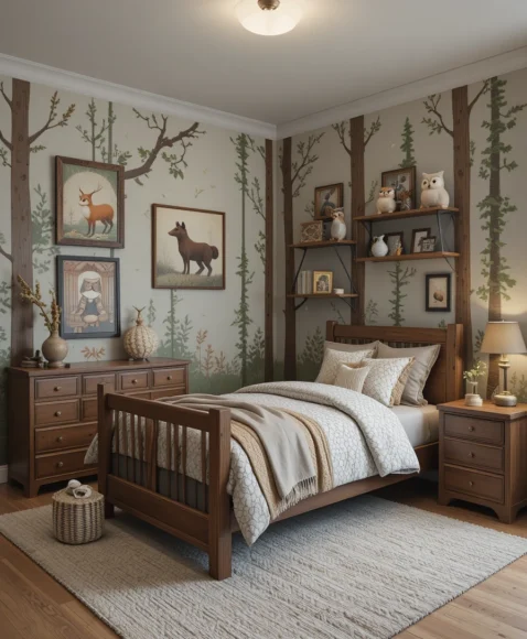 A woodland-themed bedroom brings a forest vibe indoors. Add decals of foxes, owls, and bears, wooden furniture, and soft earthy colors. Accessories like tree-shaped shelves or nature-inspired bedding create a cozy, adventurous environment. It’s ideal for a young boy who loves animals and outdoor adventures.
